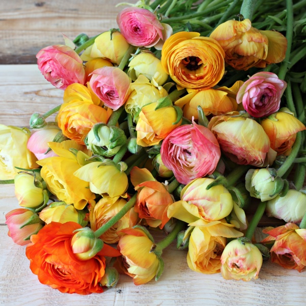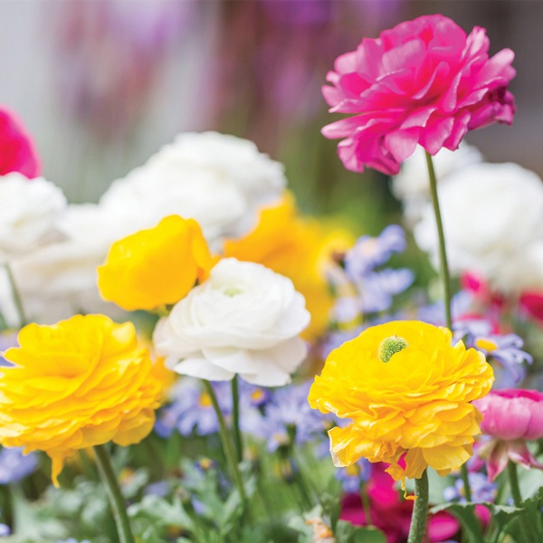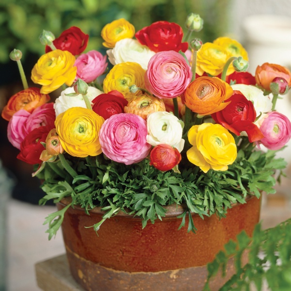 These beauties resemble tissue roses. The sheer petals overlap to form a tightly packed rosette in pure tones of red, white, yellow, pink and orange. Ranunculus are a favorite of florists and not often seen in home gardens. Each bulb produces several flowers on straight stems with parsley-like leaves. Ranunculus blooms continuously for 5 to 6 weeks. Plant with poppies and anemone for a continuous display of vibrant color.