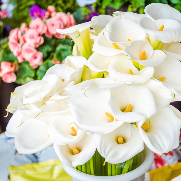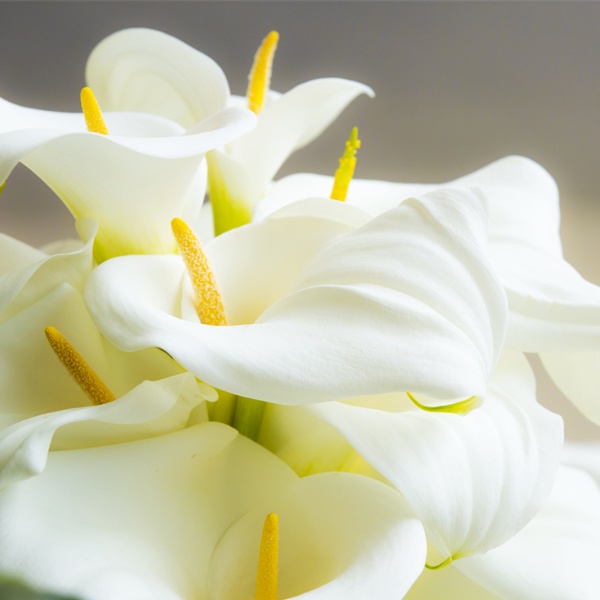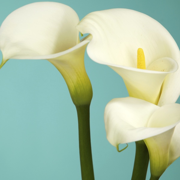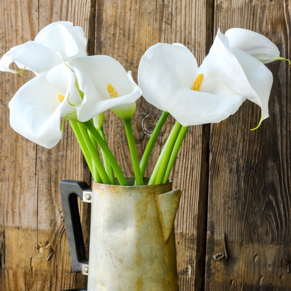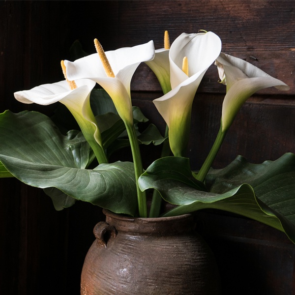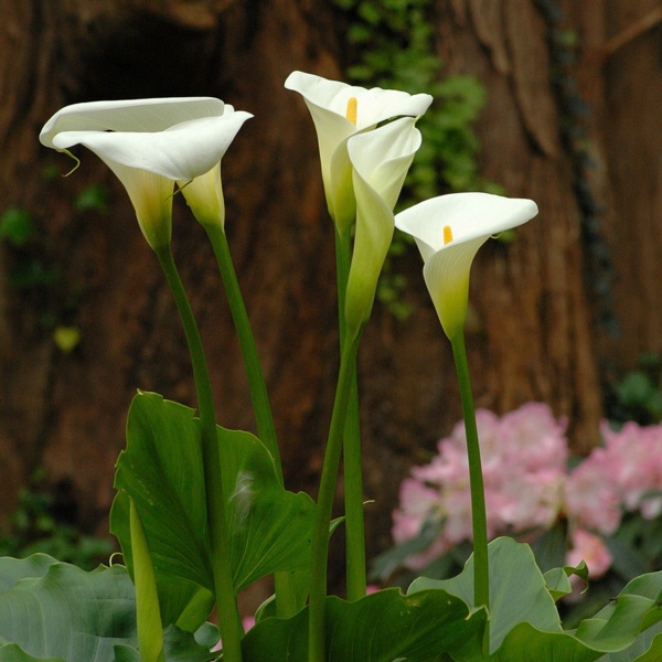 Zantedeschia aethiopica are commonly known as calla lilies and are technically not true lilies. They are native to South Africa and are members of the arum (Jack-in-the-pulpit) family. The large, stark white bloom surrounds a yellow spadix and grows atop a tall, leafless stalk that is prized in cut flower arrangements.