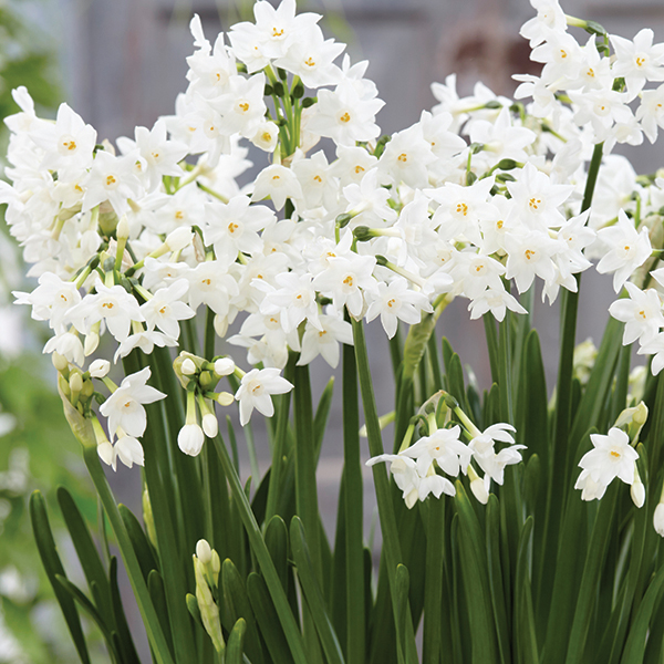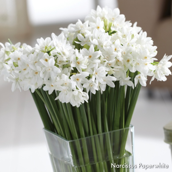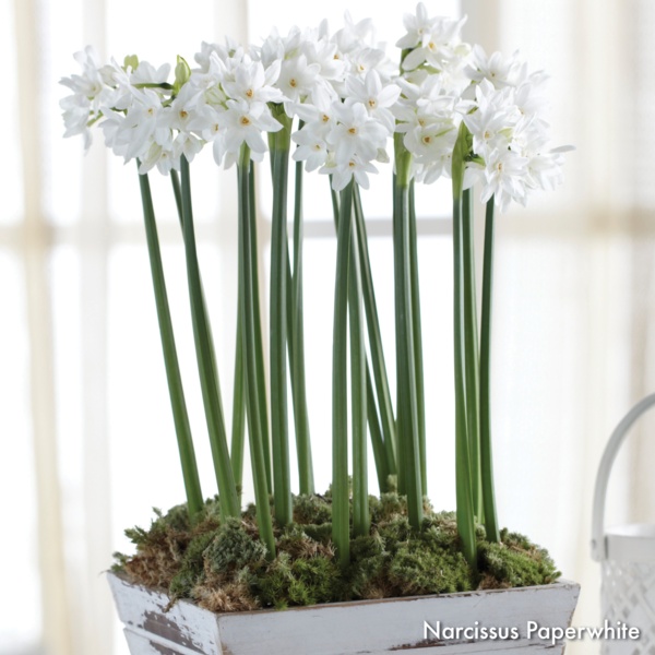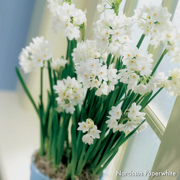 Paperwhite narcissus bulbs can be kept for months and should be planted approximately 6 weeks before desired bloom time. Store bulbs before planting at 65ºF or cooler. Paperwhites grow equally well in soil or without soil in a container with pebbles and water.