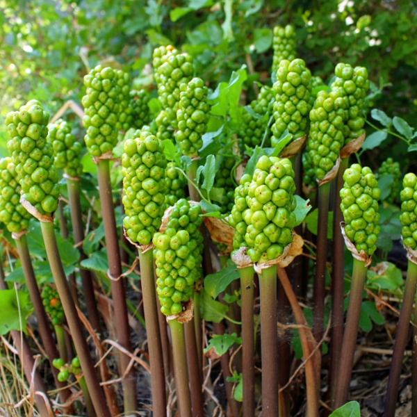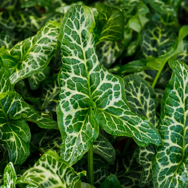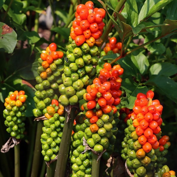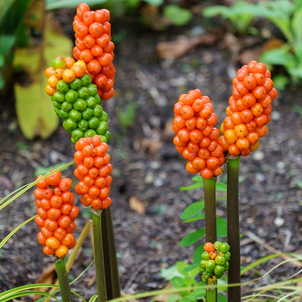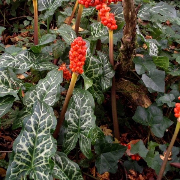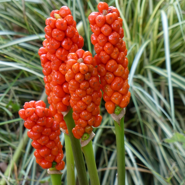 Arum italicum produces light green spathes followed by orange berry spears in late summer. Dark green foliage with unique white veining appears in fall and dies back when blooms appear. Arum italicum is native to Europe.