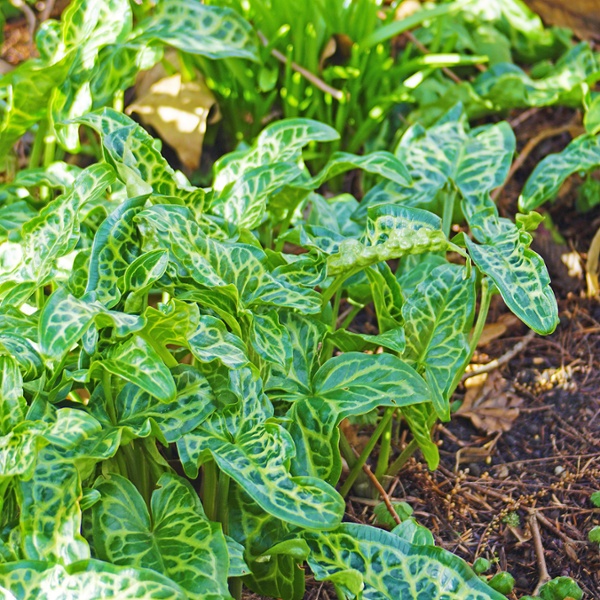 Plant Arum in the spring after all danger of frost has passed. Arum prefers full sun to partially shaded locations - full sun for cooler areas. The ideal soil is rich and porous and drains well, yet still holds enough water for the roots. If your soil is heavy clay and drains slowly, or very sandy and does not hold water, add organic soil amendments like peat moss or ground bark. Spread a 3-4 inch layer of soil amendment if needed and incorporate into the soil to a depth of 10 inches. Plant rhizomes 3-5" deep and 4-6" apart. Cover with soil. When planting a large number of Arum in one bed, excavate the entire area to the recommended depth, work fertilizer into the bottom of the trench, set out rhizomes and then cover all at once. Water thoroughly at planting. While actively growing, water frequently and thoroughly so that water will reach roots. Mulch to keep the soil cool and to prevent the soil from drying out. Apply fertilizer during growing season until foliage starts to turn yellow. After frost has damaged the foliage, dig up rhizomes, dry for a few days, trim off foliage and store in barely damp peat moss at 50-60ºF during the winter. Be sure to check on them a few times to make sure they are not too moist or too dry. Replant in spring after all danger of frost has passed.