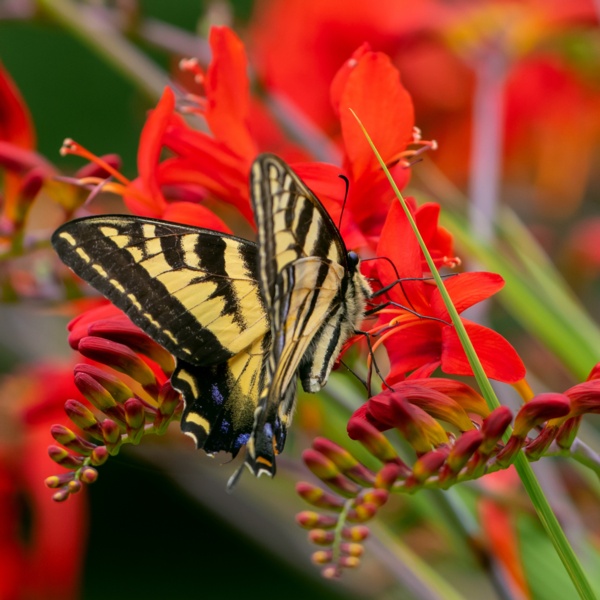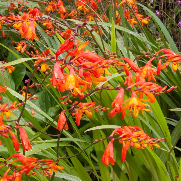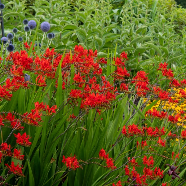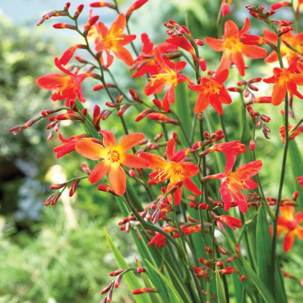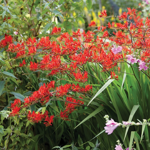 Crocosmia is a South African native that is related to gladiolas. They produce bold, exotic blooms in shades of red, orange and yellow on narrow, arching stems. Their sword-like foliage is reminiscent of gladiolas.