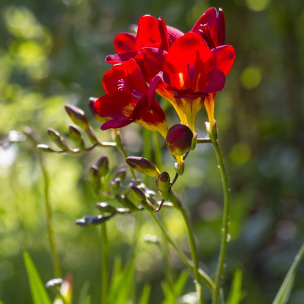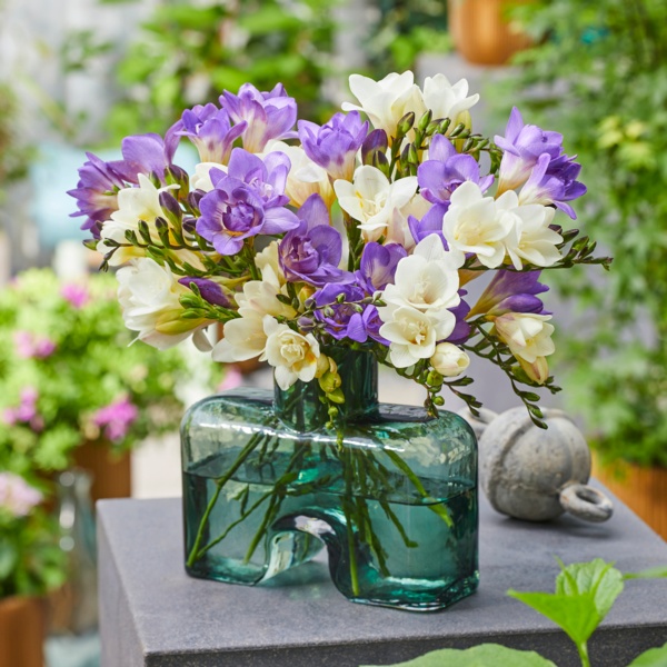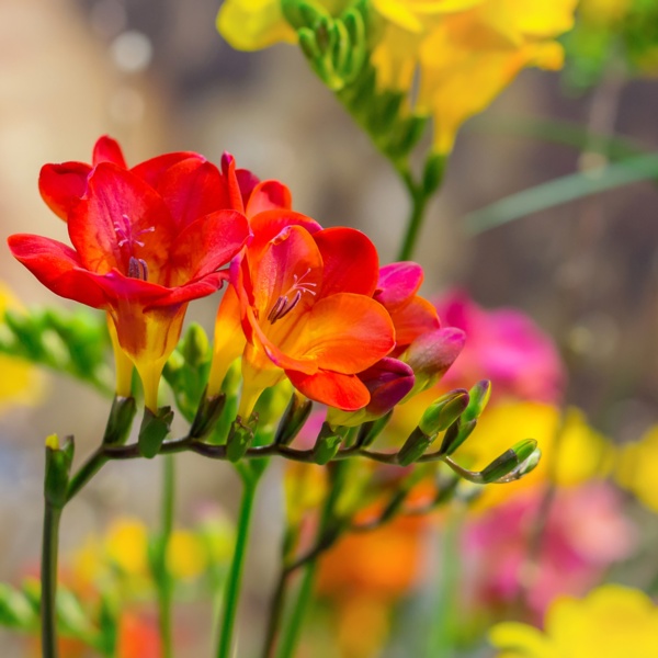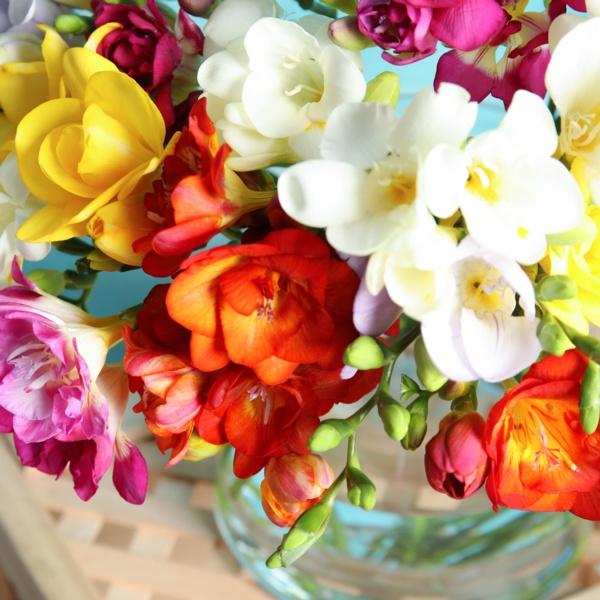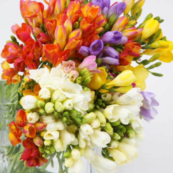 The exotic blooms of freesias are well known for their delightfully sweet fragrance. Freesias are available in a wide variety of bold, single or double blooms that appear on leafless, arching, wiry stems.