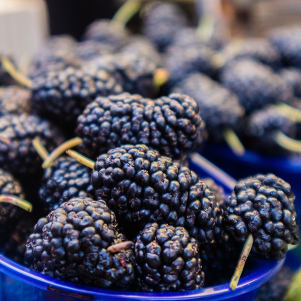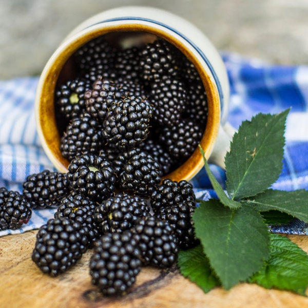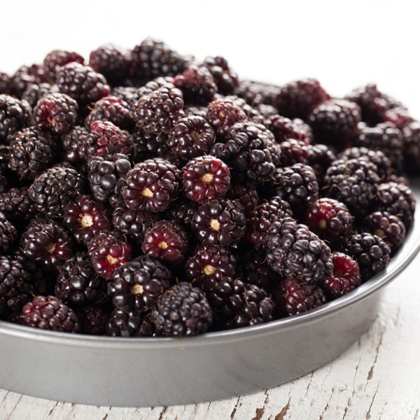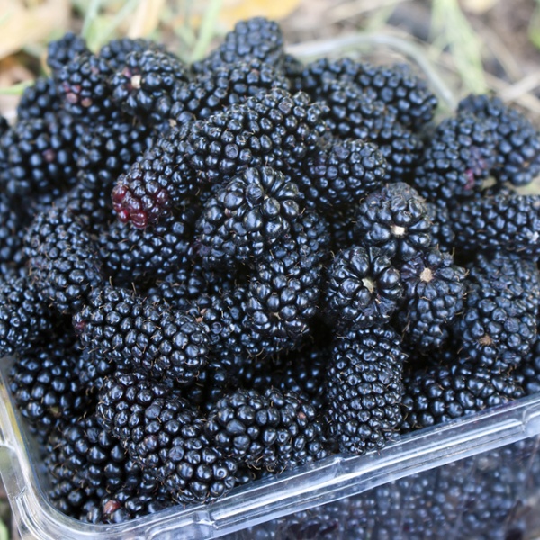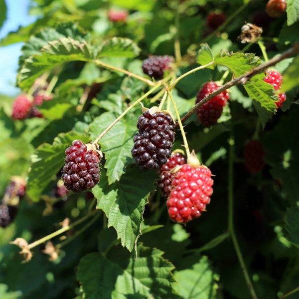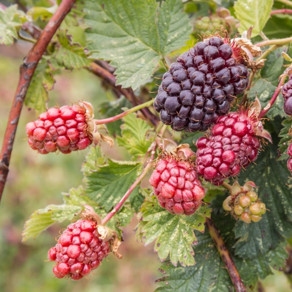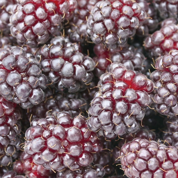 Boysenberry is a hybrid plant having blackberry, raspberry, loganberry and dewberry in its parentage. Developed by Rudolph Boysen and popularized by Walter Knott of Knott's Berry Farm who makes the popular Knott's jams, jellies and preserves. Vining bramble with thin, thorny canes – trailing blackberries group. Heat tolerant.
