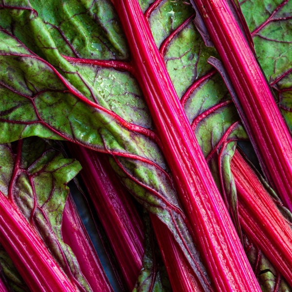 Rhubarb produces large, dark green leaves with pink-ish red and green veining. Its tender, thick stems are a bright bold red and has a tart, apple gooseberry-like flavor.