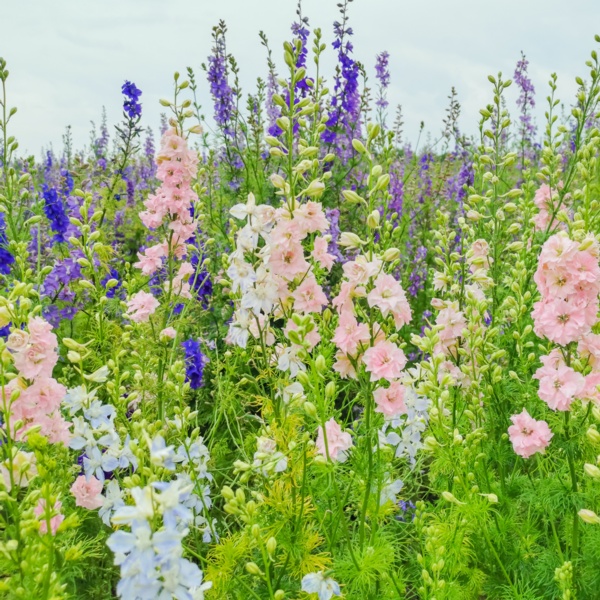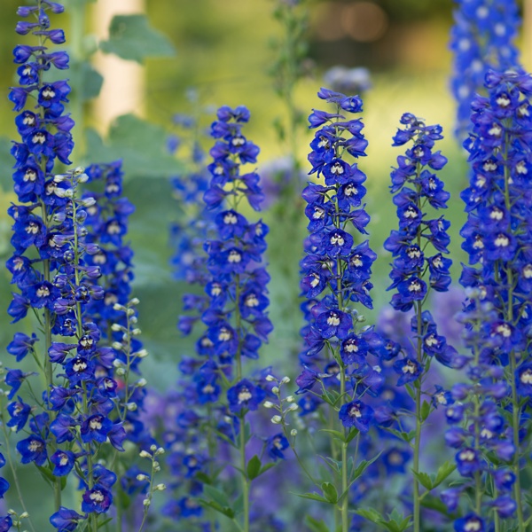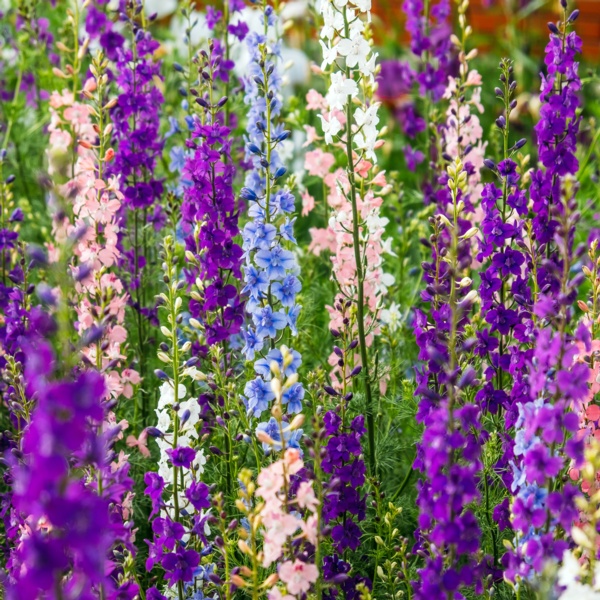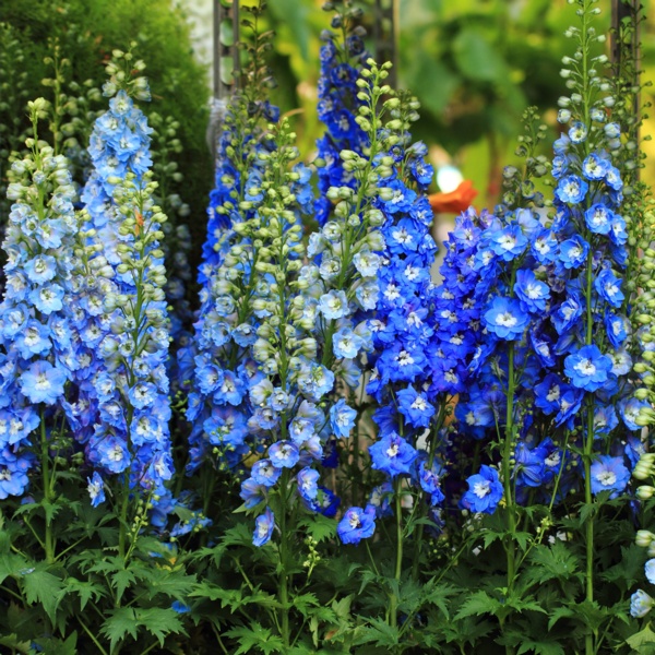 Delphiniums are most often found in cottage gardens. They come loaded with flowers! They create the perfect floral backdrop - tall and dignified - and bloom in rich shades ranging from rosy pink to blue and purple. Each tall spire is loaded with fluttery blooms, adding a vertical interest to your garden.