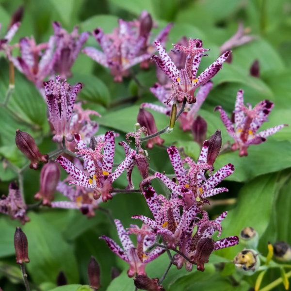 Tricyrtis, most commonly referred to as Toad Lily, is truly a one of a kind flower. Unique, white to pale lilac flowers covered with heavy purple spots are found in small clusters of 2-3 flowers. Tricyrtis are sometimes referred to as hairy toad lilies for some parts are found to be hairy.